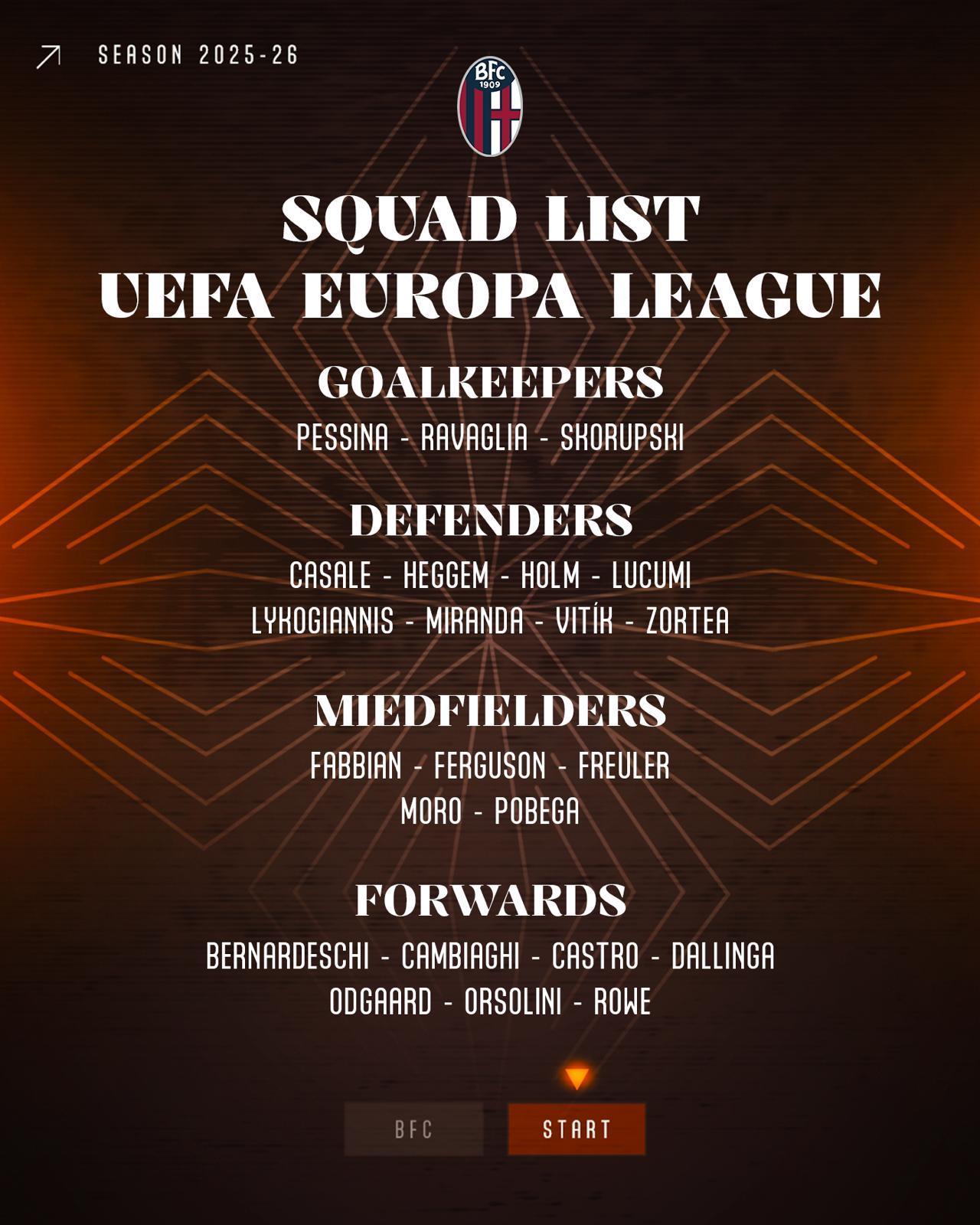 博洛尼亚欧联杯联赛阶段大名单: